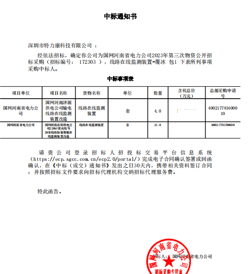 特力康中標國網黑龍江送變電工程公司的2024年度第18次物資類競爭性談判采購項目——慶陽驅鳥器物資框 特力康中標國網甘肅省電力公司省管產業單位2024年第五次物資競爭性談判授權采購項目 中標喜訊:深圳市特力康科技有限公司成功入圍許繼集團綜合能源公司輸電線路視頻在線監測裝置模塊集采項目 中標喜訊:特力康成功中標國網重慶市電力公司渝中一片區項目 特力康成功中標國網天津市電力公司2024年第二次?物?資招標項目 特力康中標國網安徽省電力有限公司蕪湖供電公司2024年3月非物質采購項目 特力康輸電線路防外力破壞系統,為江西境內綿延的輸電線路筑起“主動防護屏障”。 特力康北斗桿塔傾斜在線監測裝置,守護山西電網桿塔穩定 特力康高壓輸電線路導線覆冰在線監測裝置,為河南電網覆冰護航 鄂電穩線“哨兵”:特力康舞動監測裝置守護超高壓線路舞動安全 重慶變電站“防鳥衛士”:特力康一體化驅鳥器守護山城電網 特力康輸電線路智能AI多目監控裝置+傾斜監測守護山西輸電生命線 鄂網“全景眼”:特力康一體化視頻監控系統守護輸電線路 山東電網 “穩塔哨兵”:特力康智能桿塔傾斜監測預警裝置筑牢電力桿塔安全防線 寧夏配電線路安裝了我司防外破電子化智能警示牌