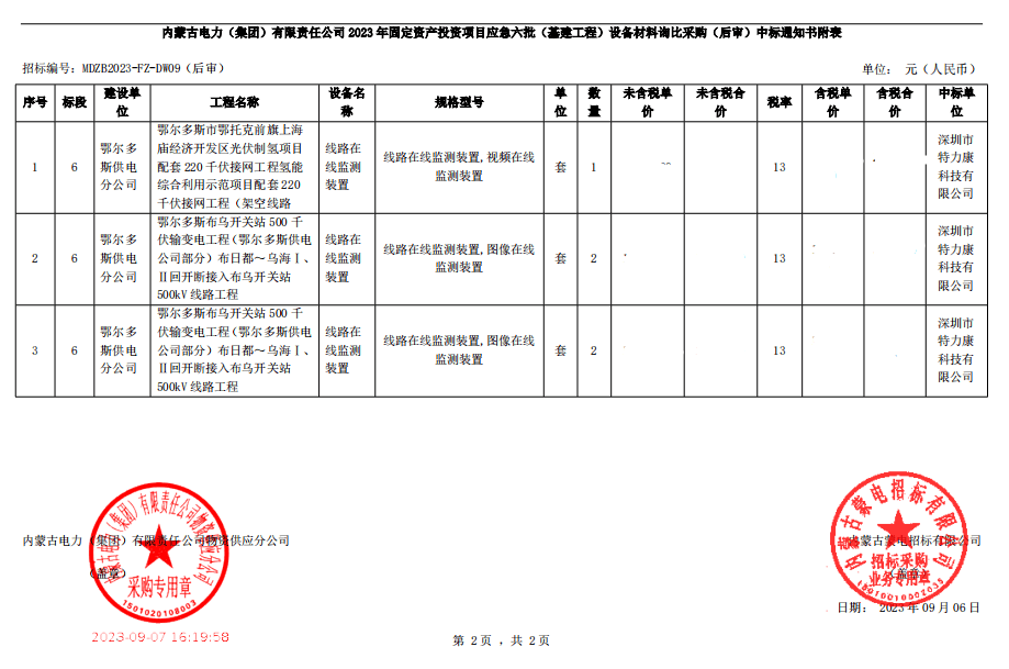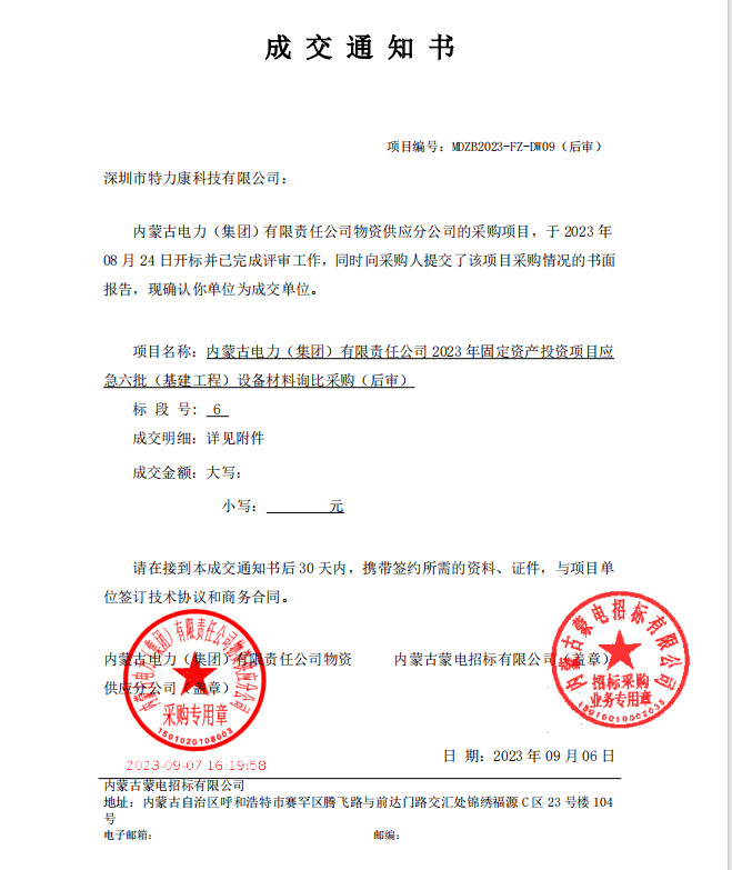內(nèi)蒙古電力(集團(tuán))有限責(zé)任公司物資供應(yīng)分公司的采購項(xiàng)目,于2023年08月24日開標(biāo)并已完成評審工作,同時(shí)向采購人提交了該項(xiàng)目采購情況的書面報(bào)告,現(xiàn)確認(rèn)我單位為成交單位,中標(biāo)通知如下:
