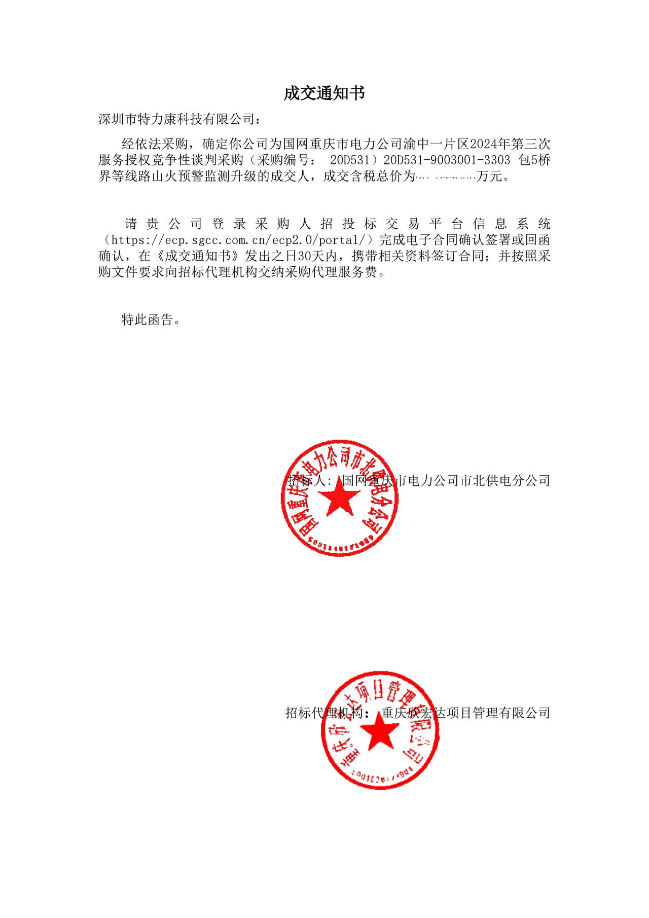 深圳,2024年4月26日——深圳市特力康科技有限公司(以下簡稱“特力康”)近日收到喜訊,經(jīng)過嚴格的評審和競爭性談判,我司成功中標國網(wǎng)重慶市電力公司渝中一片區(qū)2024年第三次服務授權(quán)競爭性談判采購項目(采購編號:20D531)中的20D531-9003001-3303包5橋界等線路山火預警監(jiān)測升級服務。