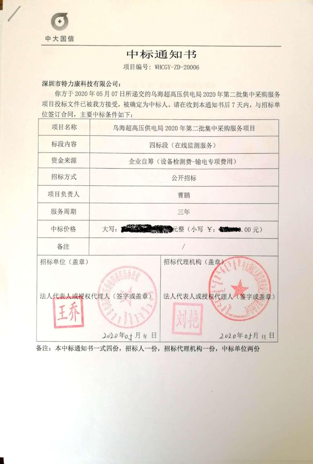 經(jīng)招標(biāo)領(lǐng)導(dǎo)組批準(zhǔn),我司于2020年05月07日所遞交的烏海超高壓供電局2020年第二批集中采購(gòu)服務(wù)項(xiàng)目(四標(biāo)段:在線監(jiān)測(cè)服務(wù))投標(biāo)文件已被局方接受,被確定為中標(biāo)人。特發(fā)中標(biāo)通知書,如下:
