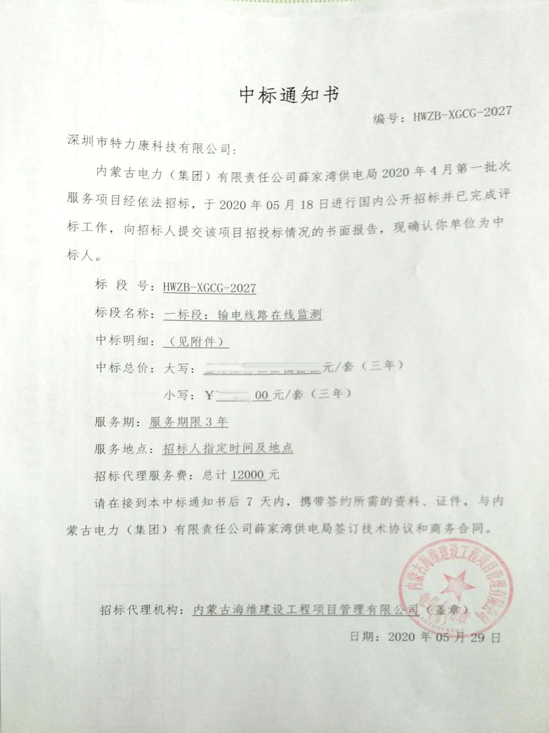 內蒙古電力(集團)有限責任公司薛家灣供電局2020年4月第一批次服務項目(一標段:輸電線路在線監測)經依法招標,于2020年05月18日進行國內公開招標并已完成評標工作,向招標人提交該項目招投標情況的書面報告,現確認我司(深圳市特力康科技有限公司)為中標人。特發中標通知書,如下: