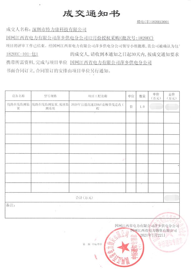 國網江西省電力有限公司萍鄉供電分公司12月份授權采購(批次號: 1820EC)項目的評審工作已結束。經國網江西省電力有限公司萍鄉供電分公間領導小組批準,我司(深圳市特力康科技有限公司)被確認為包1820EC- 101-包1(線路在線監測裝置,覆冰監測系統)的成交人,成交通知如下: