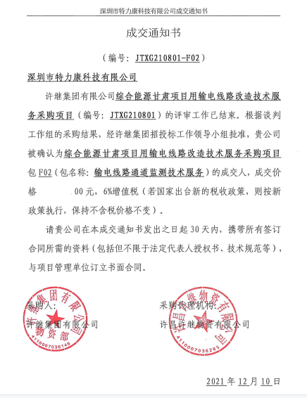 許繼集團有限公司綜合能源甘肅項目用輸電線路改造技術服務采購項且(編號: JTXG210801) 的評審工作已結束。根據談判工作組的采購結果,經許北集團招投標工作領導小組批準。我司被確認為綜合能源甘肅項目用輸電線路改造技術服務采購項目包F02(包名稱:輸電線路通道監測技術服務)的成交人,成交通知如下: