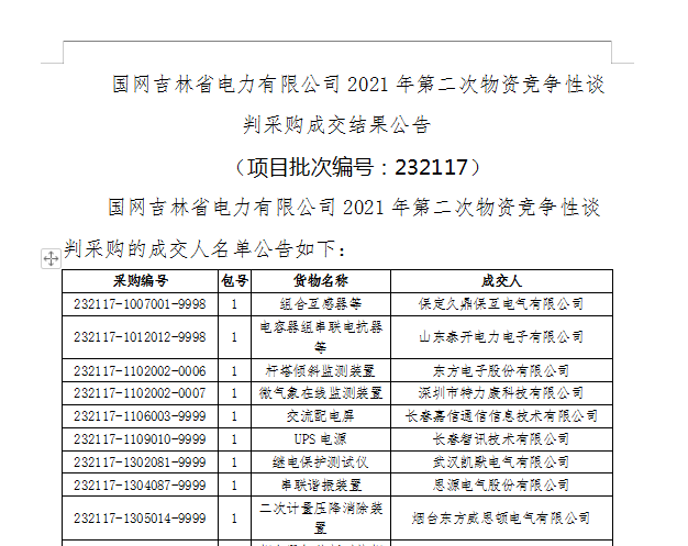 特力康中標國網吉林省電力有限公司2021年第二次物資競爭性談判(項目批次編號: 232117)-微氣象在線監測裝置,國網吉林省電力有限公司2021年第二次物資競爭性談判采購的成交人名單公告如下: