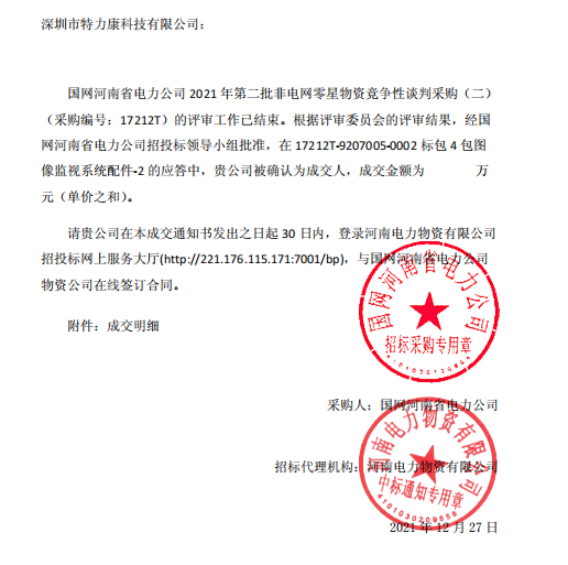 國網(wǎng)河南省電力公司2021年第二批非電網(wǎng)零星物資競(jìng)爭性談判采購(二)(采購編號(hào): 17212T) 的評(píng)審工作已結(jié)束。根據(jù)評(píng)審委員會(huì)的評(píng)審結(jié)果。經(jīng)國網(wǎng)河南省電力公司招投標(biāo)領(lǐng)導(dǎo)小組批準(zhǔn),在172127-9207005-0002標(biāo)包4包圖像監(jiān)視系統(tǒng)配件-2的應(yīng)答中。貴公司被確認(rèn)為成交人,成交通知如下:
